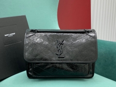 【P1430】YSL包包官网 圣罗兰进口抓纹牛皮Niki女包单肩包28CM 黑色