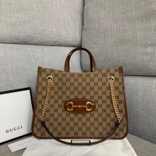 Gucci女包价格 古奇621144啡色牛皮拼老花1955马衔扣链条托特包单肩包35CM