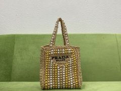 【P720】一件代发 Prada普拉达2022新款1BG425杏色草编配彩色球托特包