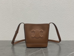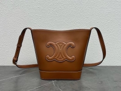 【P1130】Celine包包批发 赛琳新出黄褐棕牛皮浮雕Logo斜挎水桶包100433