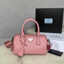 Prada包包价格 普拉达66667进口十字纹牛皮女包手提单肩斜挎包22CM 粉色