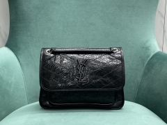 【P1320】YSL女包批发 圣罗兰黑色皱纹油蜡皮小号Niki链条肩背包633160黑色银扣