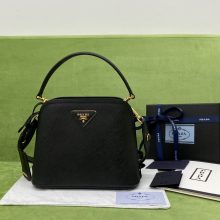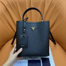 Prada女包批发 普拉达76651十字纹牛皮手提斜挎水桶包中号23CM 黑色