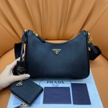 Prada女包批发 普拉达91288黑色三合一十字纹牛皮Hobo单肩包腋下包22.5CM