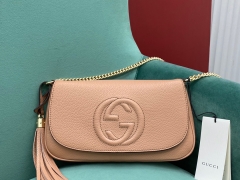 【P1050】Gucci包包批发 古奇经典双G图案流苏吊饰链条斜挎女包 杏色