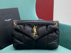 【P1430】圣罗兰包包官网 YSL LOULOU PUFFER系列黑色绗缝羊皮单肩女包 金扣