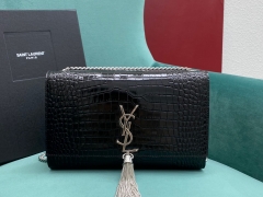 【P1130】圣罗兰女包批发 YSL经典款354119黑色鳄鱼纹流苏链条斜挎包 银扣