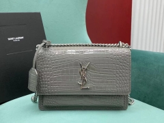 【P1500】YSL日落包价格 圣罗兰升级版鳄鱼纹牛皮Sunset链条单肩包 灰色银扣