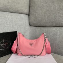 普拉达包包官网 Prada Hobo粉色进口尼龙布链条单肩斜挎女包23CM